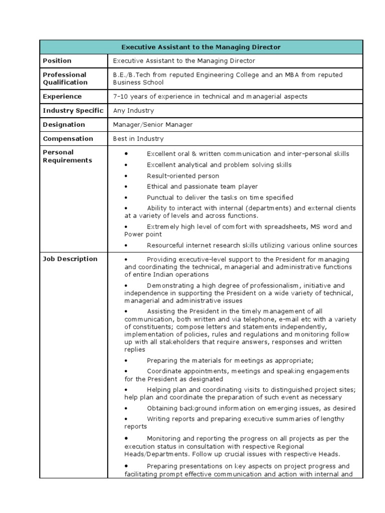 Executive Assistant To Managing Director Job Description : Office Manager Job Description Job Description Examples Topresume - On behalf of the executive director, the personal assistant will communicate with others outside and inside the organization, will manage busy schedules, and will complete complex administrative tasks.. Post on job boards for free. We are seeking an experienced executive driver to the managing director of the company. View job description, responsibilities and qualifications. Most consider an executive assistant an executive level job. Assistant to managing director job description salary:
